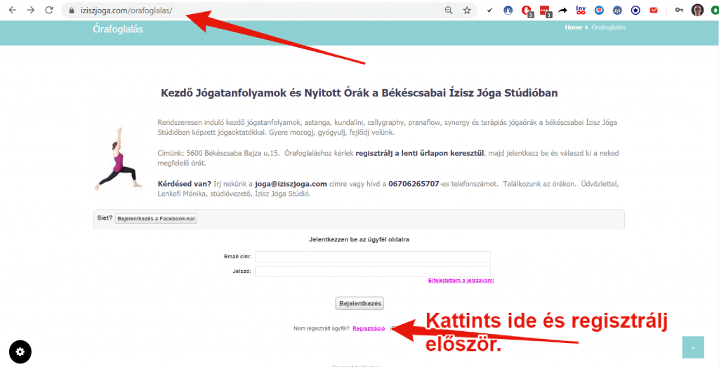 1. Az órákra minden alkalommal regisztrálnod kell az Ízisz Jóga Stúdió órarendjén keresztül, itt: Órafoglalás az Online Jógaórákra MOST: kérlek kattints az órafoglalás oldalon lévő Regisztráció linkre.